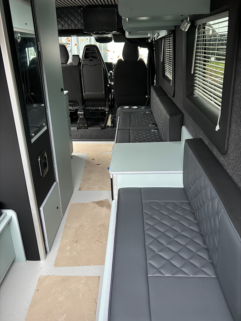This custom panel van camper conversion showcases a sleek, modern interior designed for comfort, practicality, and everyday usability on the road. Finished in a stylish grey colour palette with quilted upholstery and clean cabinetry lines, the layout creates a bright, open living space that feels both functional and refined.