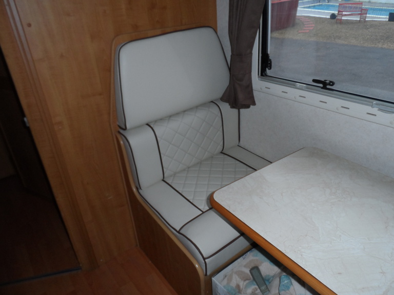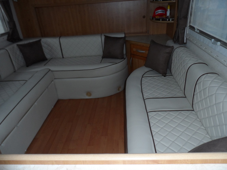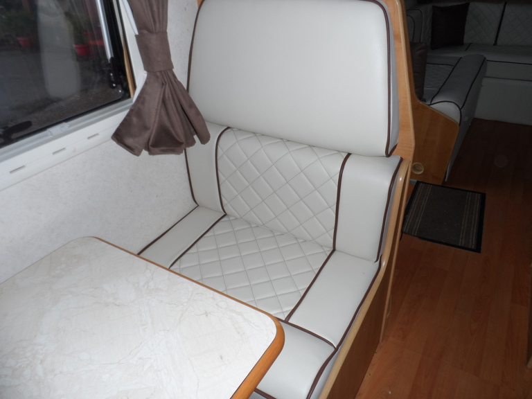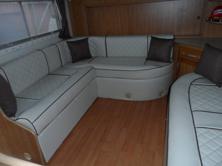 - Custom Living Area – Luxurious white leather seating and sleeping options, crafted with easy-to-clean, hard-wearing materials for a fresh, modern finish.