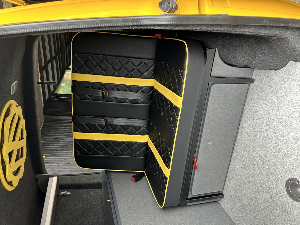 - Twin Bench Lounge Seating – Premium black leather with yellow contrast stitching for style and comfort, adaptable for sleeping.