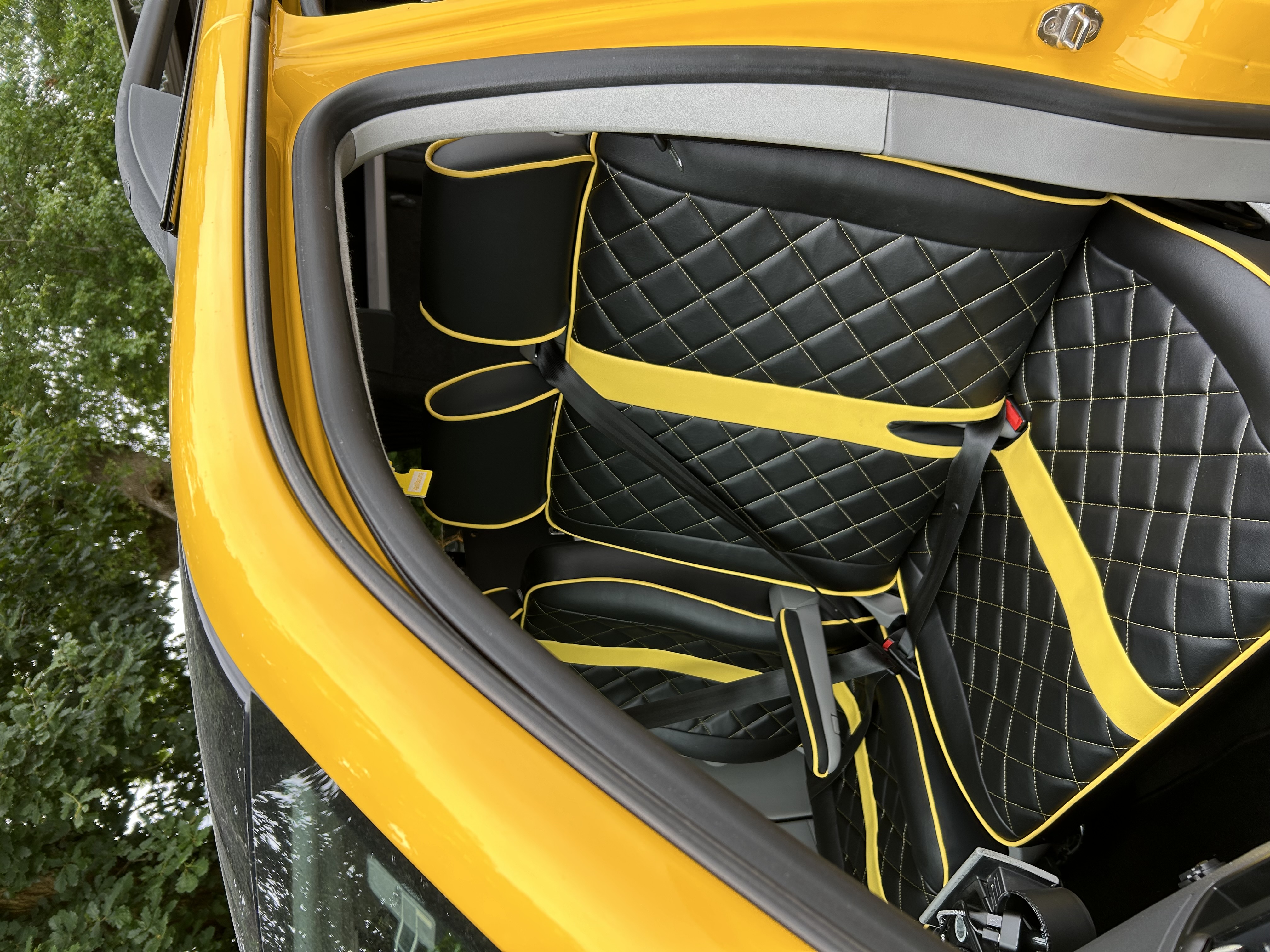 This bespoke yellow T5 campervan conversion in South Wales combines style, comfort, and practicality for life on the road. Featuring black leather seating with vibrant yellow stitching, sleek cabinetry, and a smart layout, the interior feels modern, open, and inviting.