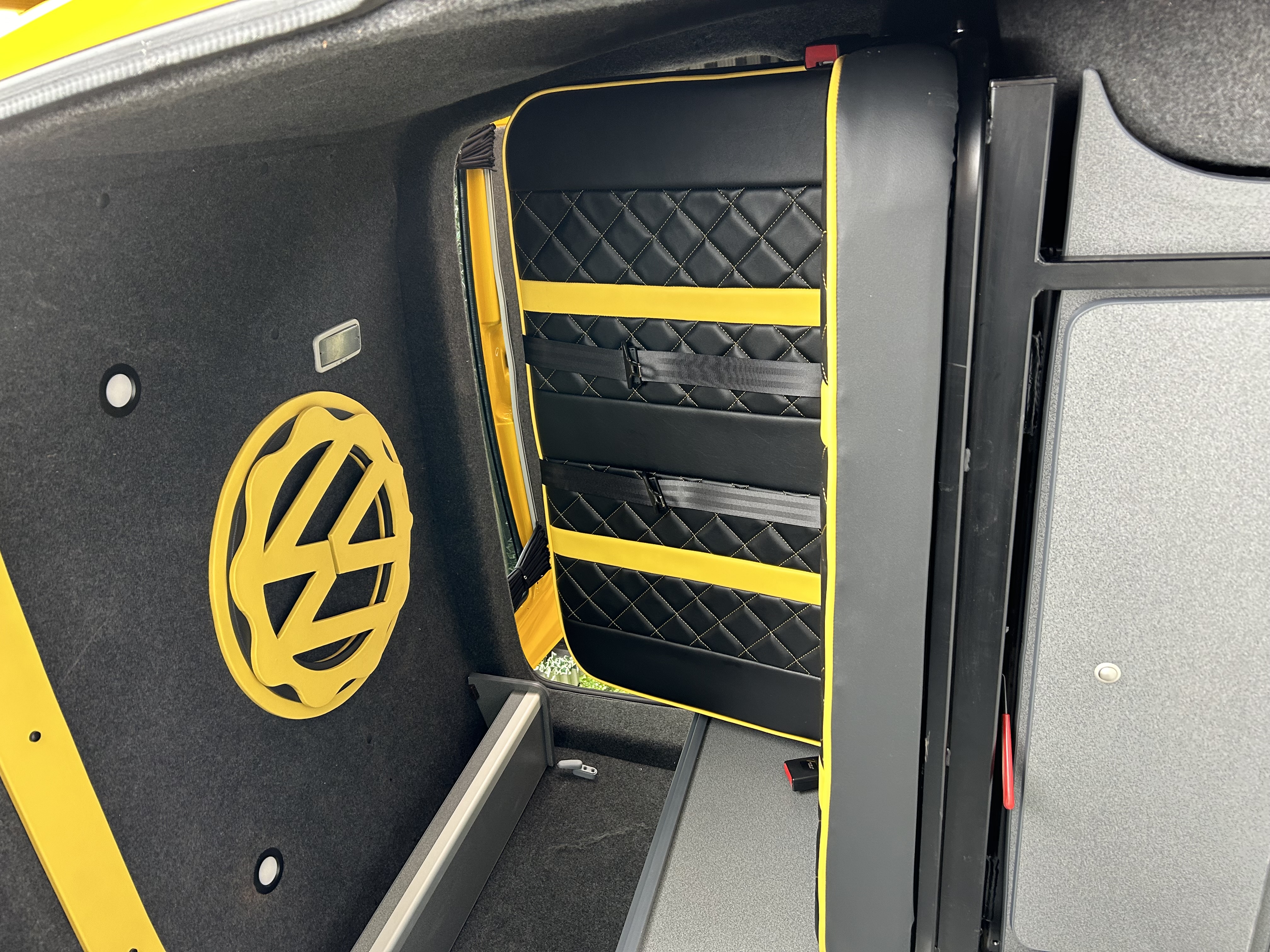 This T5 campervan balances striking design with everyday usability. The black and yellow interior, smart layout, and ambient lighting create a space that is both visually impactful and comfortable for touring.