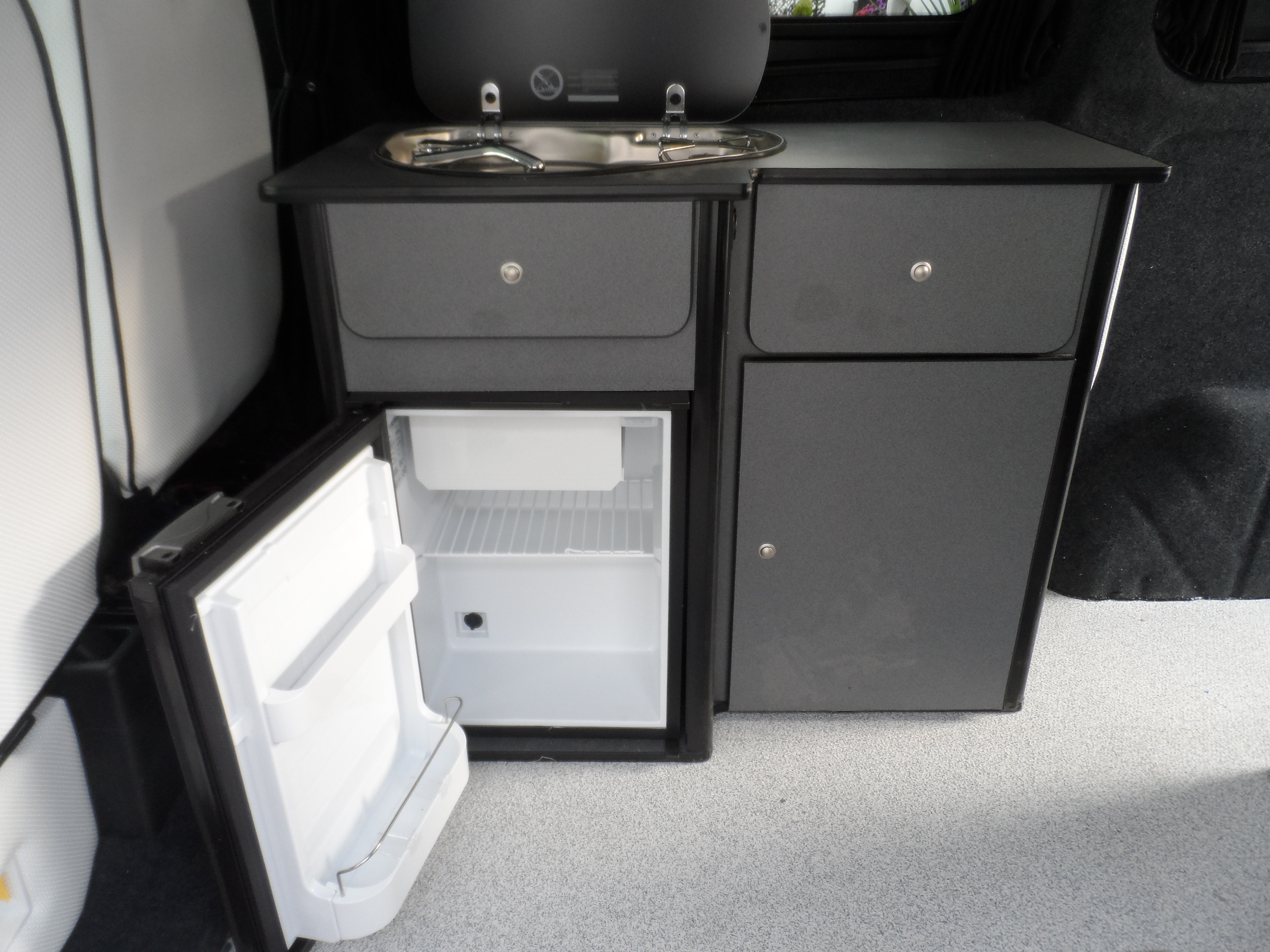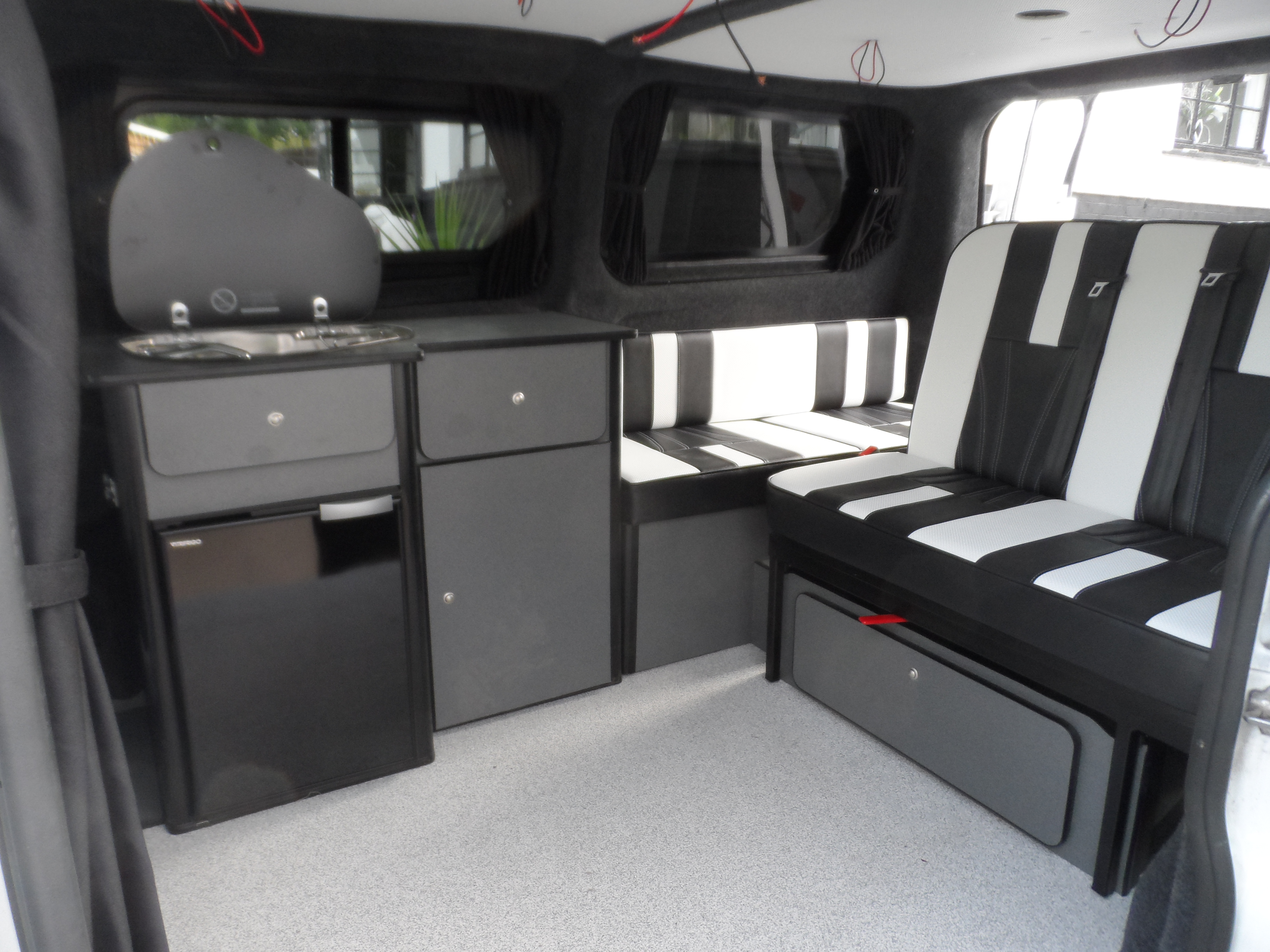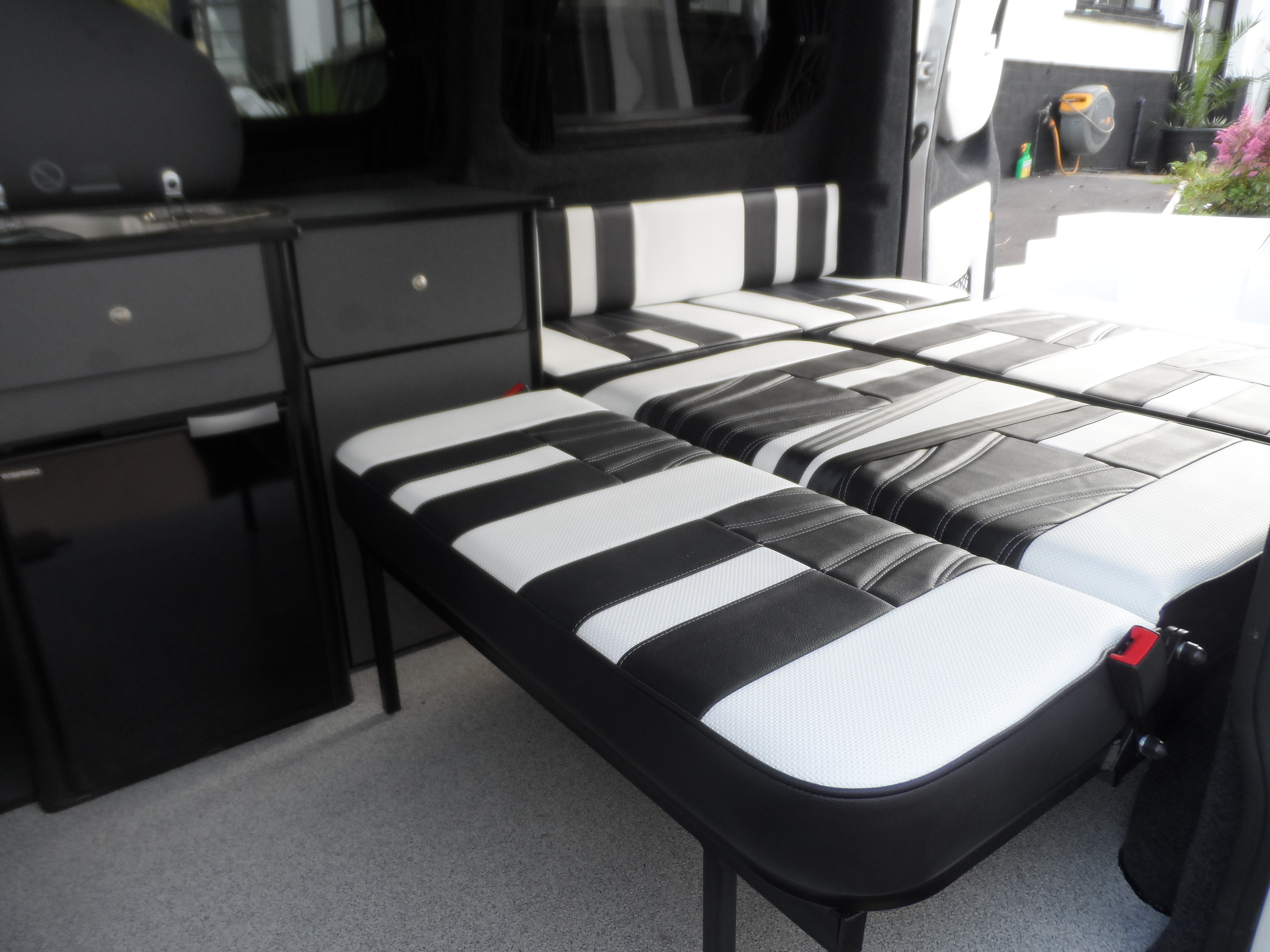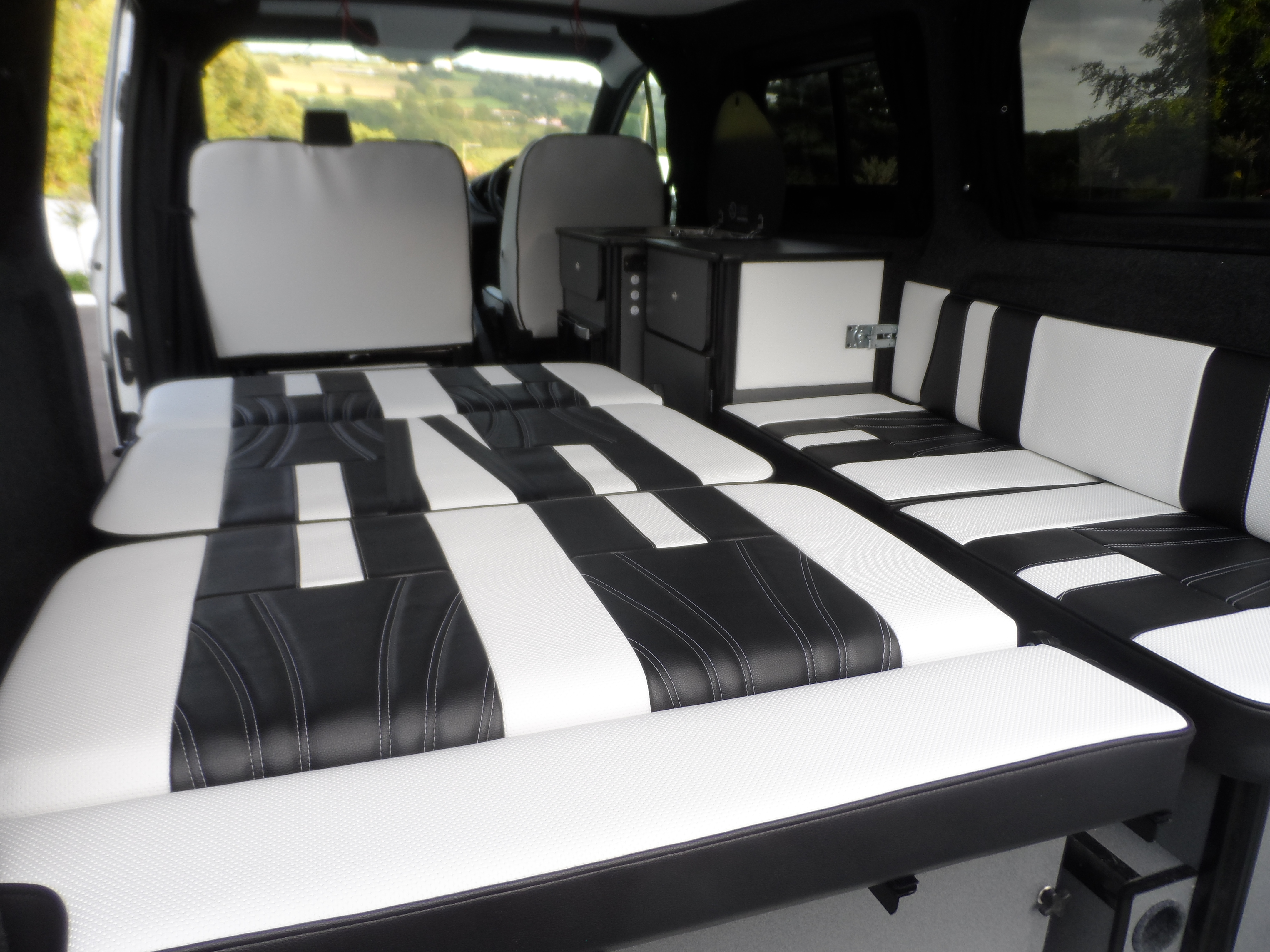 Handcrafted in South Wales, this campervan interior combines practicality and luxury. The black and white leather trim transforms the cabin into a space that’s sleek, comfortable, and ready for life on the road.